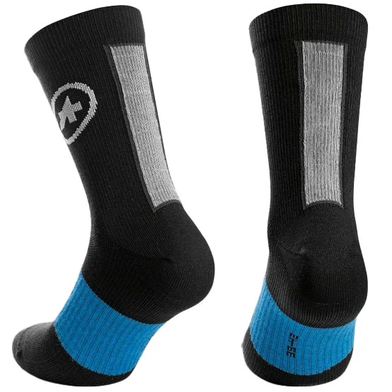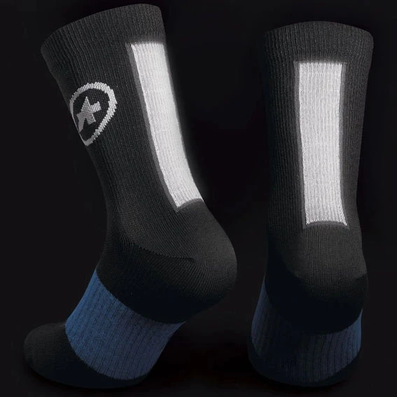 Rijden in de winter vereist sokken die comfortabel, ondersteunend en isolerend zijn en goed zicht bieden. Om aan deze eisen te voldoen heeft Assos gekozen voor een uniek mengsel van in katoen gewikkeld elastomeer dat een naadloos ontwerp creëert voor lichte compressieve ondersteuning en een licht isolerend effect voor de voet, de enkel en het onderbeen. Dit mengsel zorgt voor een gebreide stof die effectief isoleert en vocht via het garen naar de buitenkant transporteert, zodat uw voeten droog en comfortabel blijven in uw schoenen. Speciaal voor de voetboog heeft Assos een geribbelde band ontwikkeld die deze omsluit voor nog meer steun en meer ademend vermogen. De contrasterende reflecterende tape langs de achillespees zorgt voor een betere zichtbaarheid bij weinig licht. De blauwe climaCode voor de winter is nu een opvallend visueel signaal voor het dragen van de lagen over elkaar, en helpt ook bij het organiseren van de garderobe.