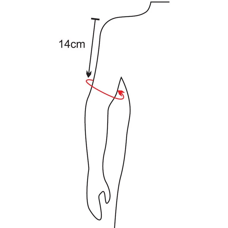 Meet de volledige omtrek van de biceps 14 cm onder de buitenrand van het schouderbeen (zie foto).