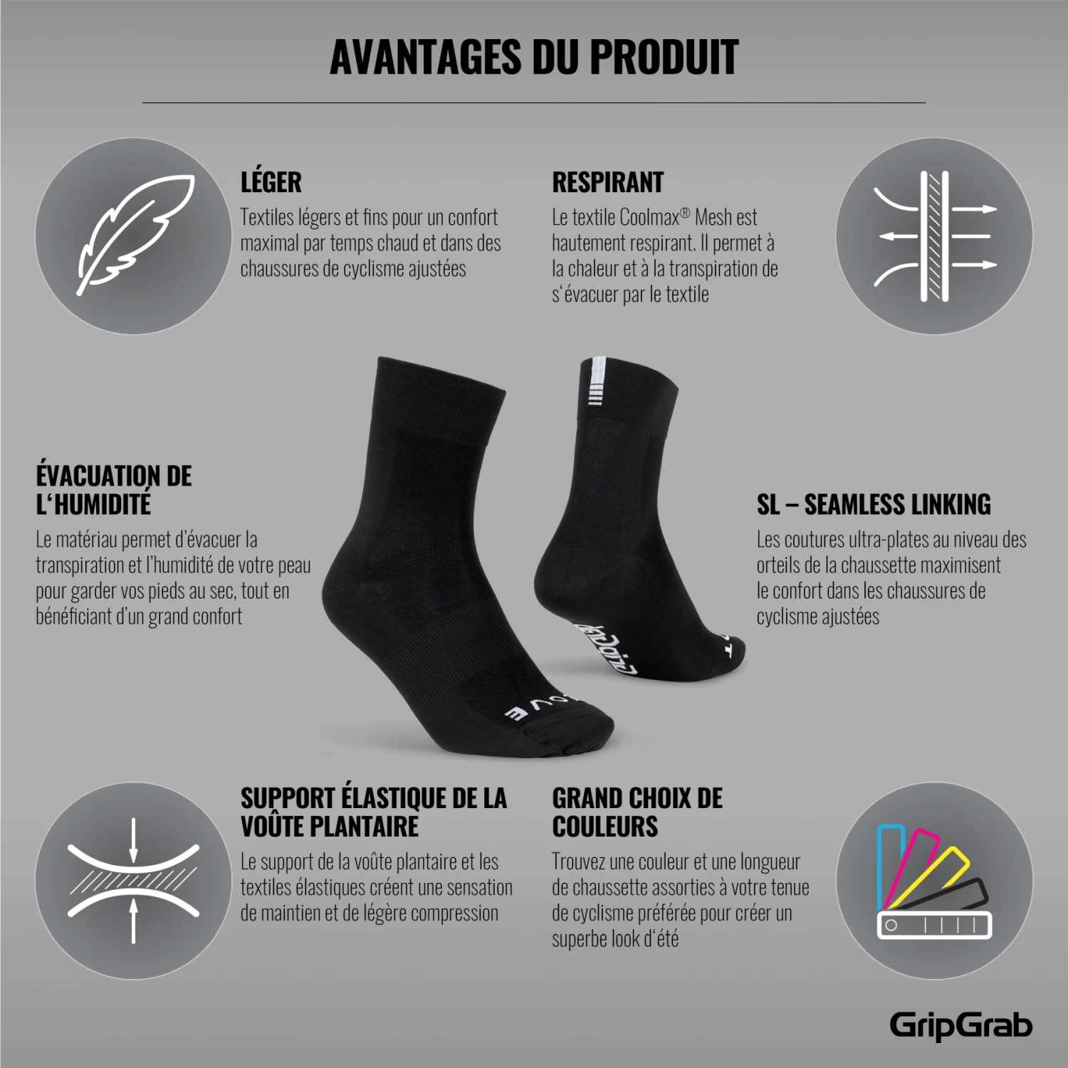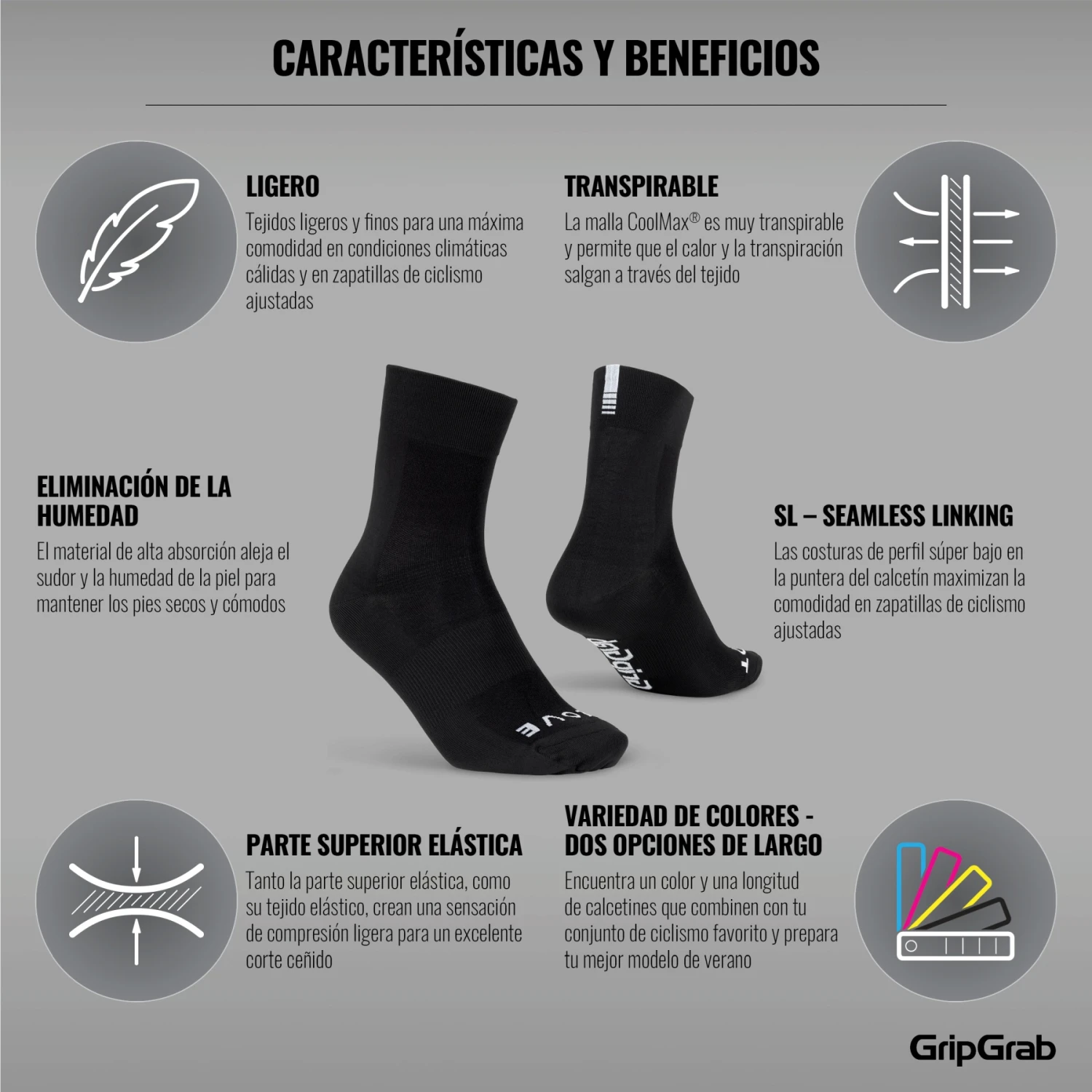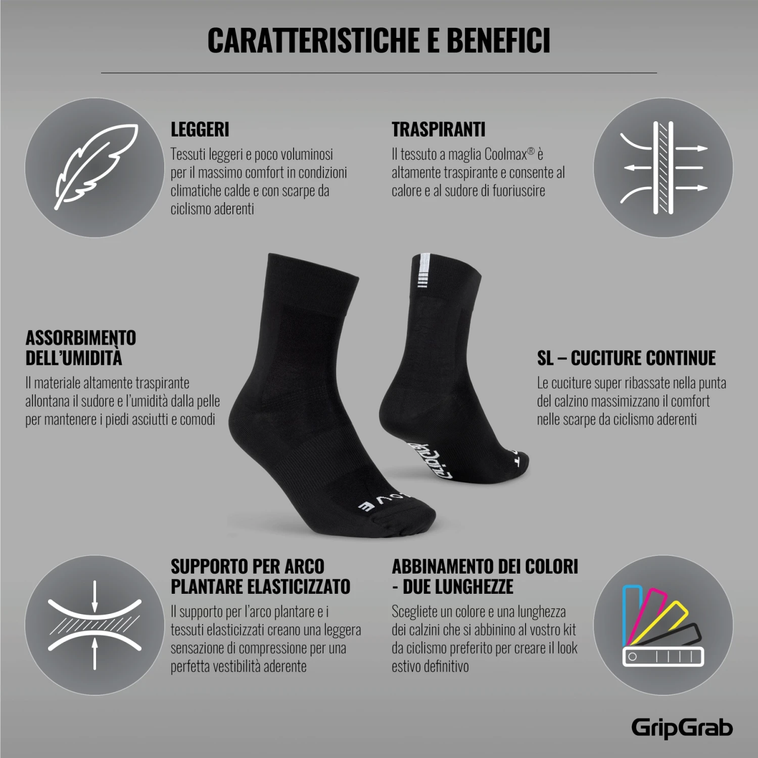 De GripGrab Lightweight SL sokken bieden comfort en stijl op zalige zomerdagen. Ze zijn gemaakt van een lichtgewicht en ademend Coolmax® materiaal met een subtiel logo en zijn verkrijgbaar in verschillende kleuren – zodat u ze perfect kunt afstemmen op uw zomerse fietsoutfit of gewoon op uw stijl en stemming.