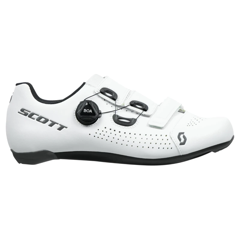 Of het nu gaat om prestatiegerichte rijders, eersteklas Gran Fondo-deelnemers of avonturiers: de SCOTT Road Team Boa® is de perfecte schoen voor onvermoeibare krachtoverbrenging en rijcomfort op lange afstanden. De schoen is gemaakt van glad, asymmetrisch en meegaand microvezel bovenwerk en biedt een nauwsluitend, aanpasbaar profiel met een Boa® IP1 wartel in het bovenwerk. In combinatie met de klittenbandsluiting voor een anatomische pasvorm in het onderste gedeelte kan de schoen perfect worden aangepast aan elke voetvorm. De ErgoLogic binnenzool biedt de hele dag optimale ondersteuning dankzij inzetstukken in de voetboog en het middenvoetgebied. De zool van injectie-composietmateriaal heeft een groter verstelbereik voor de pedaalplaat en stijfheidsindex 8.