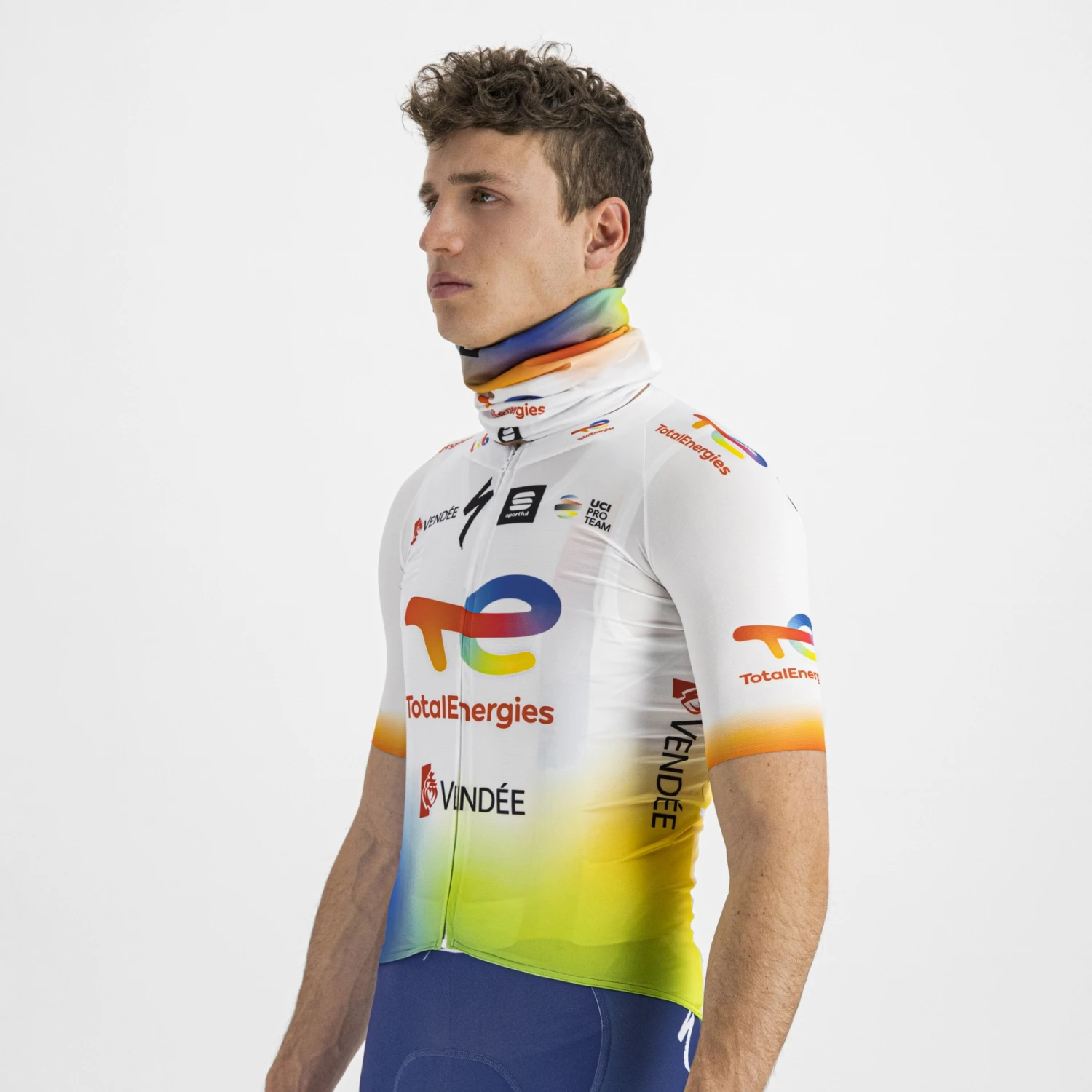 Dubbelzijdige van Aerostretch-stof met sublimatieprint. Past bij de rest van de TotalEnergies serie.